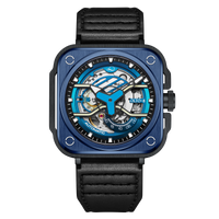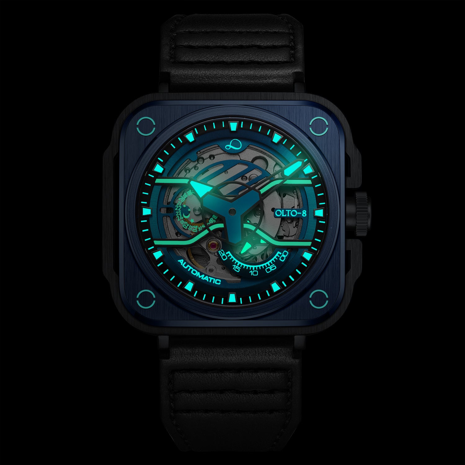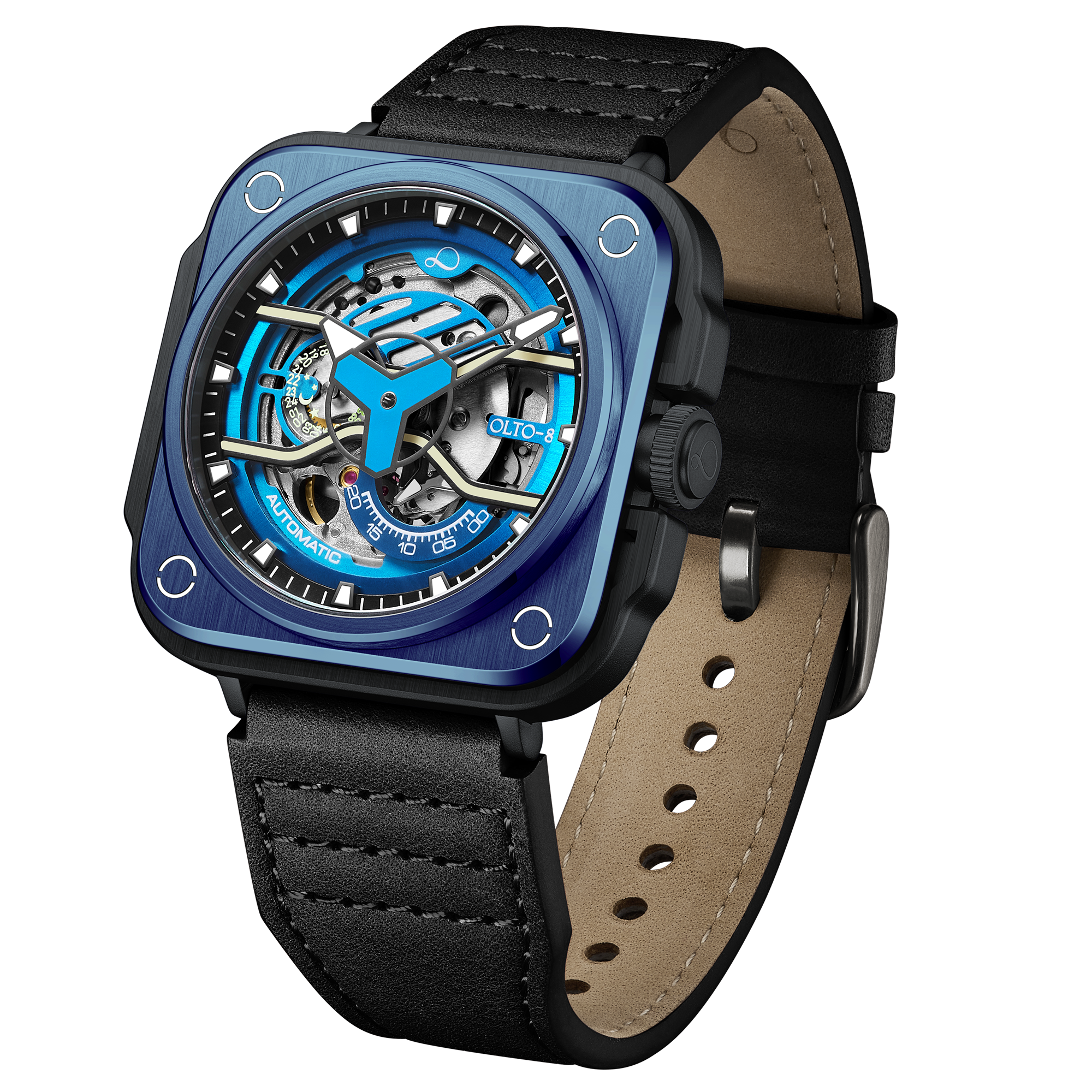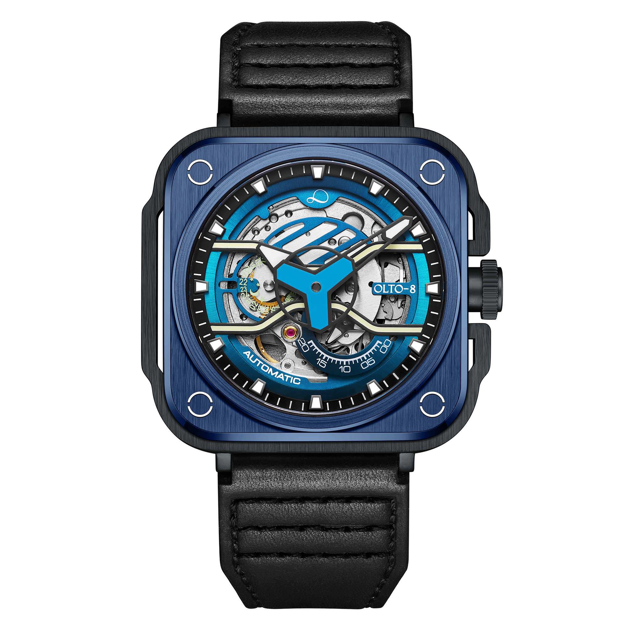لك ساعة OLTO-8 IRON-EX مربعة هيكلية أوتوماتيكية زرقاء تأتي الساعة مع ضمان الحماية لمدة خمس سنوات :