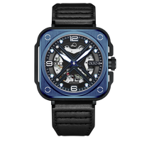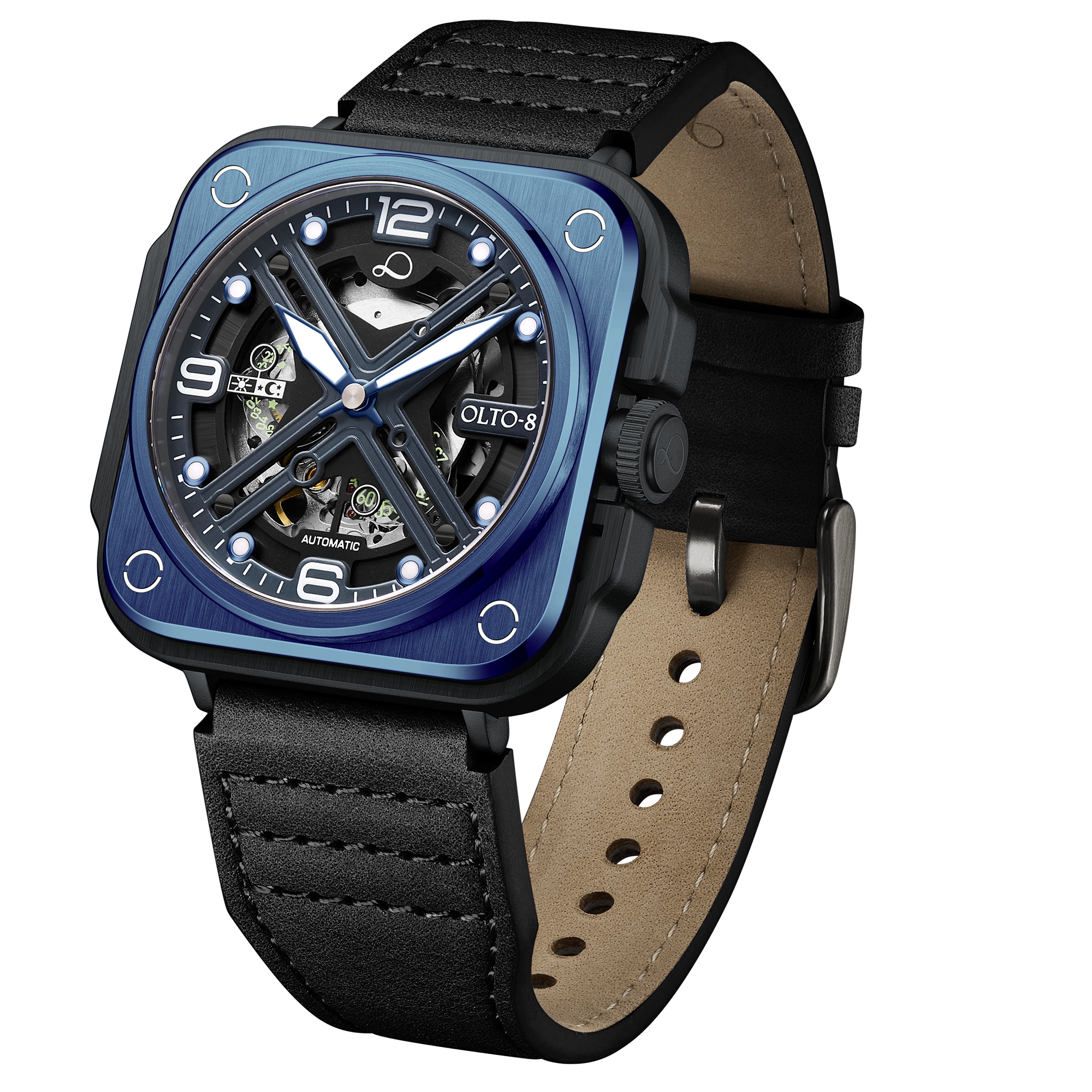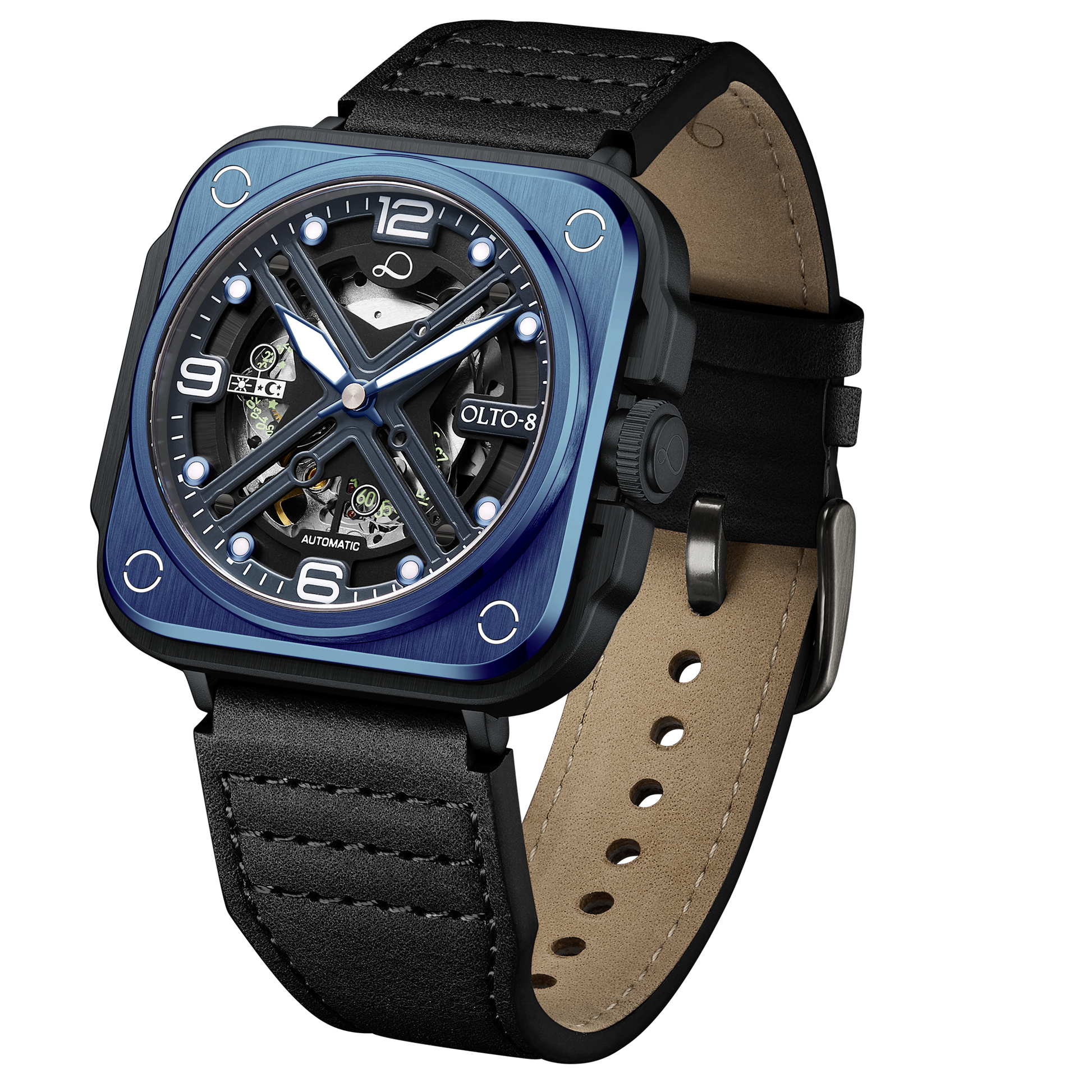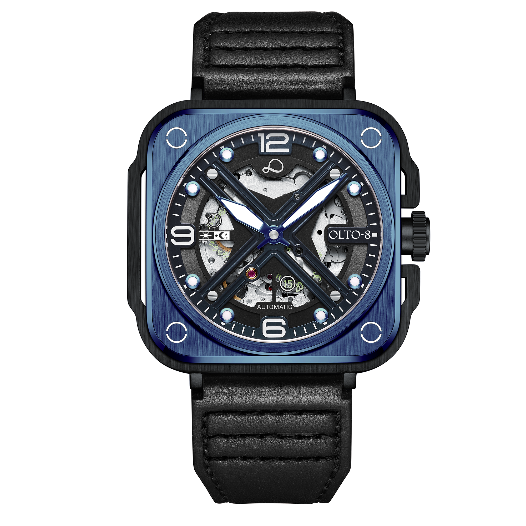 لك ساعة OLTO-8 IRON-X مربعة هيكلية أوتوماتيكية زرقاء تأتي الساعة مع ضمان الحماية لمدة خمس سنوات :