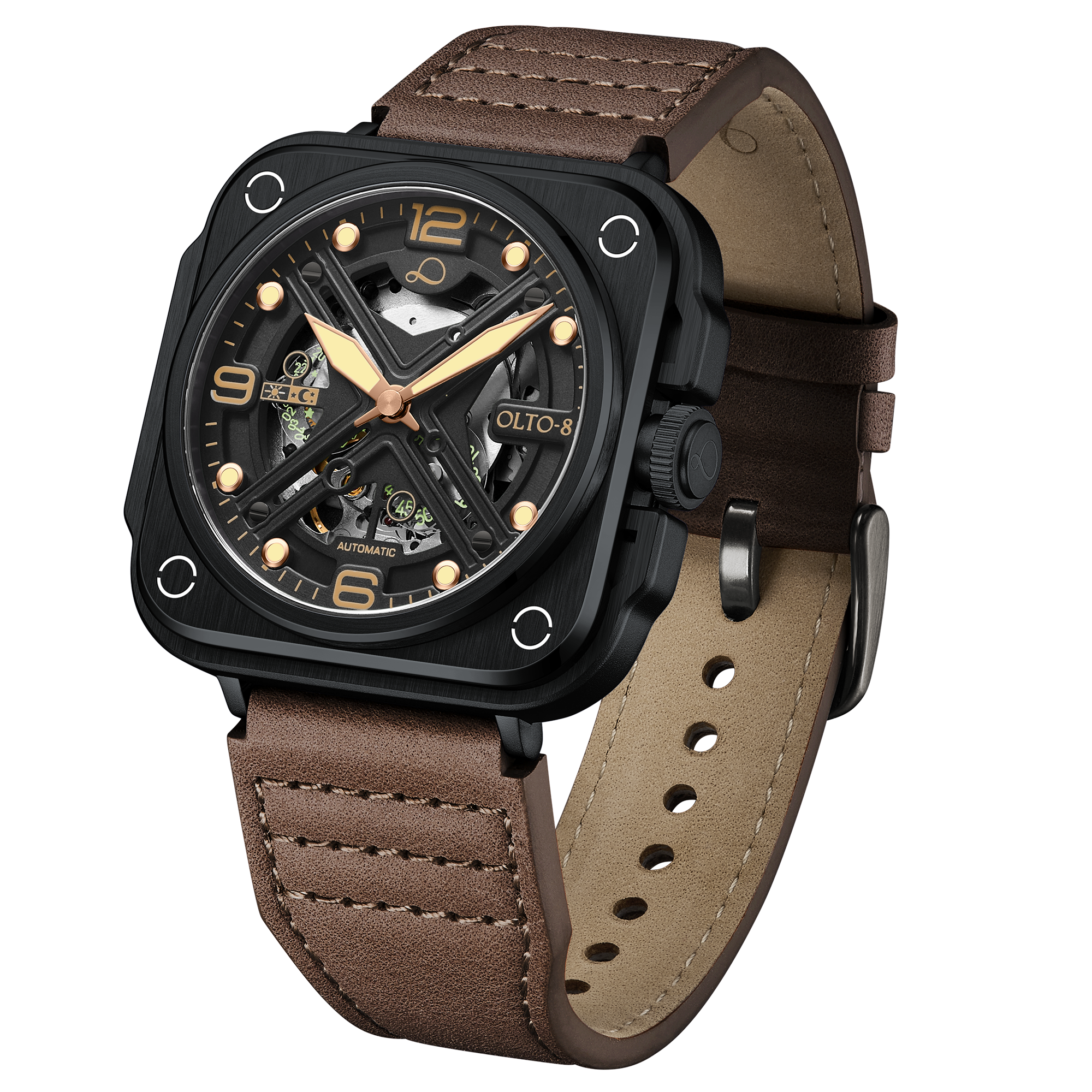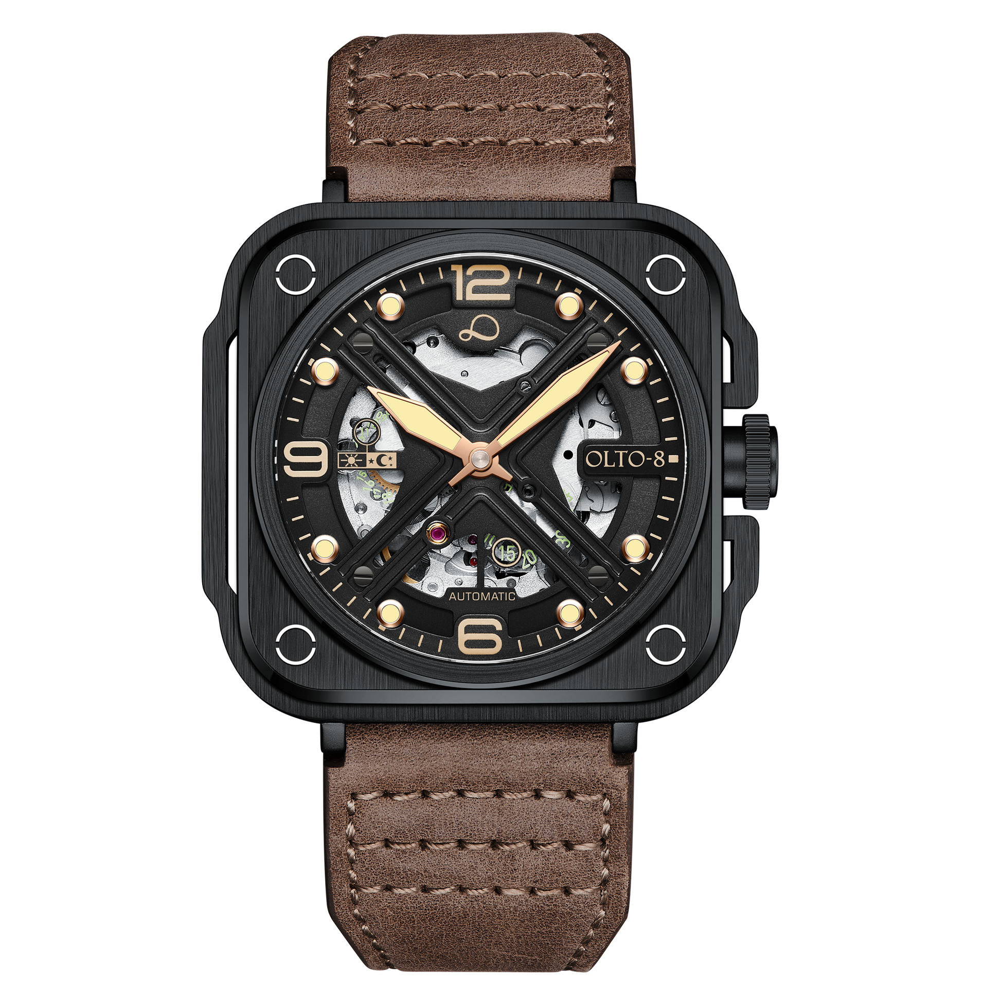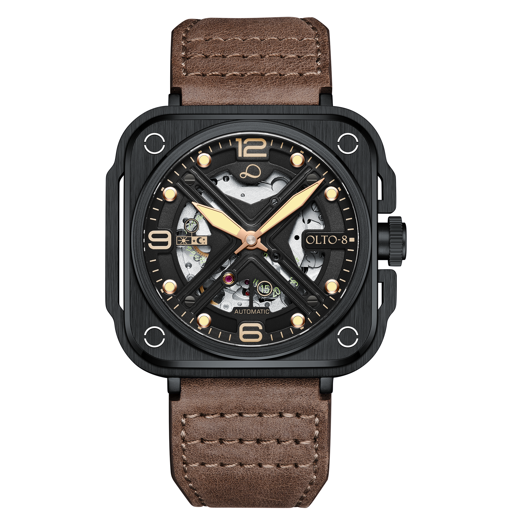 لك ساعة OLTO-8 IRON-X مربعة هيكلية أوتوماتيكية بنية اللون تأتي الساعة مع ضمان الحماية لمدة خمس سنوات :