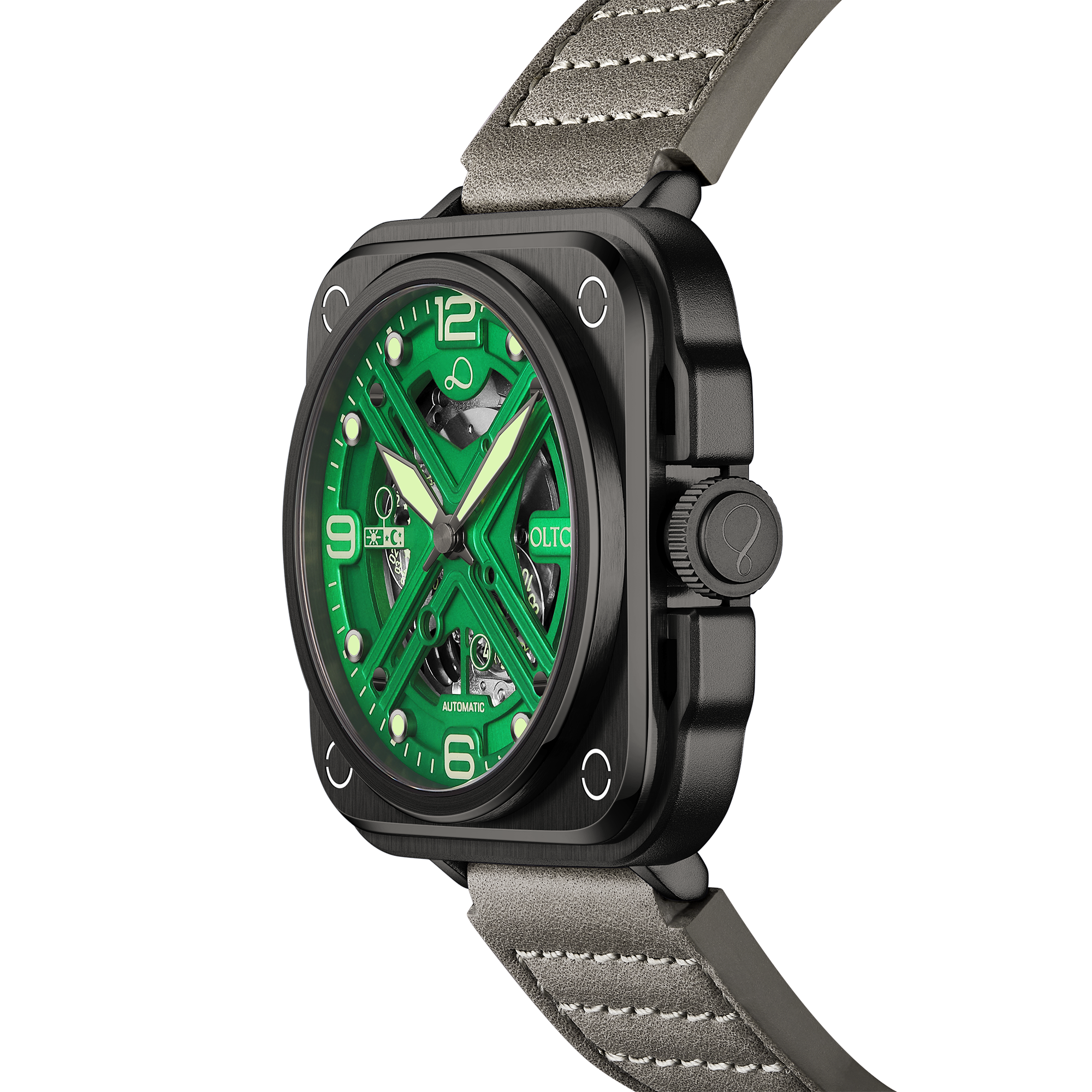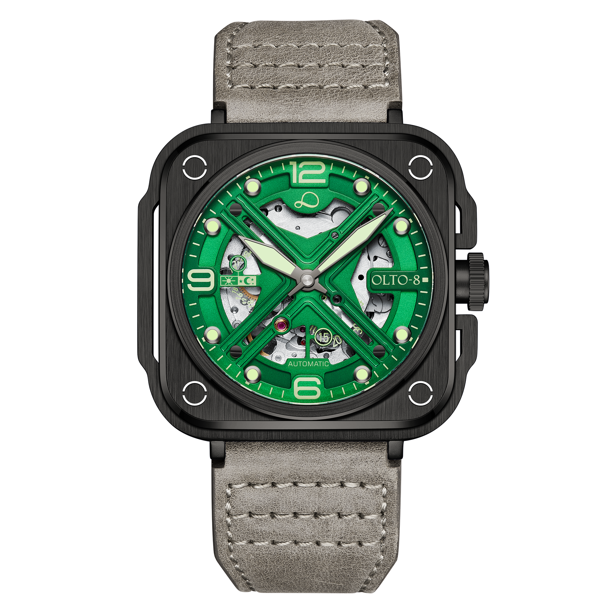 لك ساعة OLTO-8 IRON-X مربعة هيكلية أوتوماتيكية خضراء تأتي الساعة مع ضمان الحماية لمدة خمس سنوات :