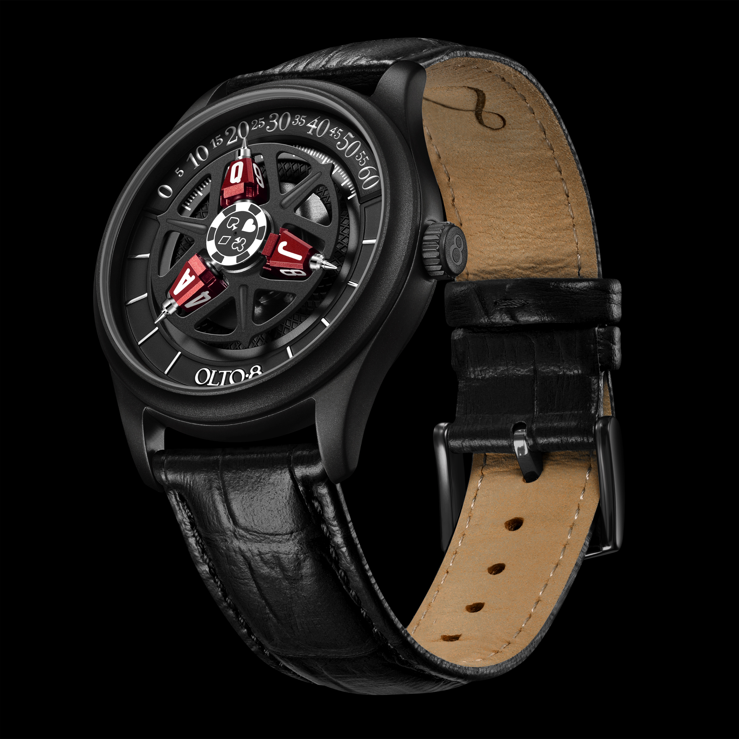 لك ساعة OLTO-8 KING ثلاثية الأبعاد مزودة بعجلة أوتوماتيكية باللون الأحمر تأتي الساعة مع ضمان الحماية لمدة خمس سنوات :