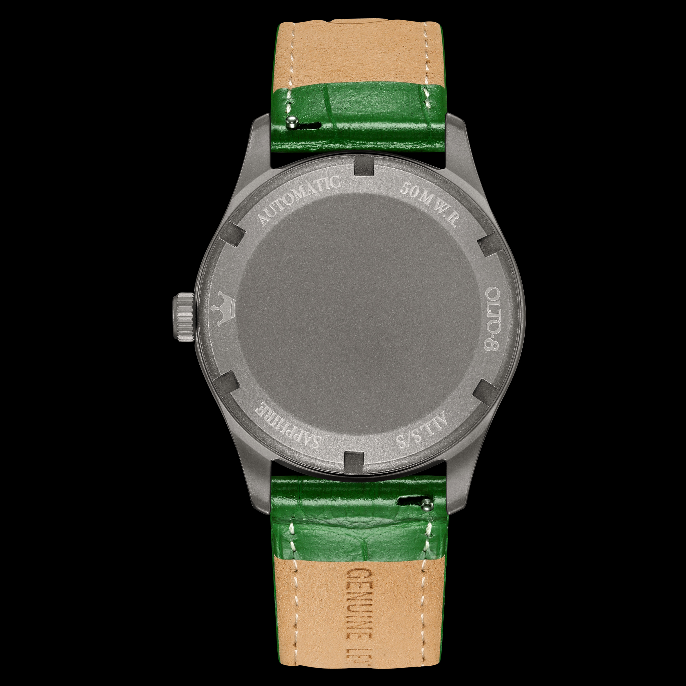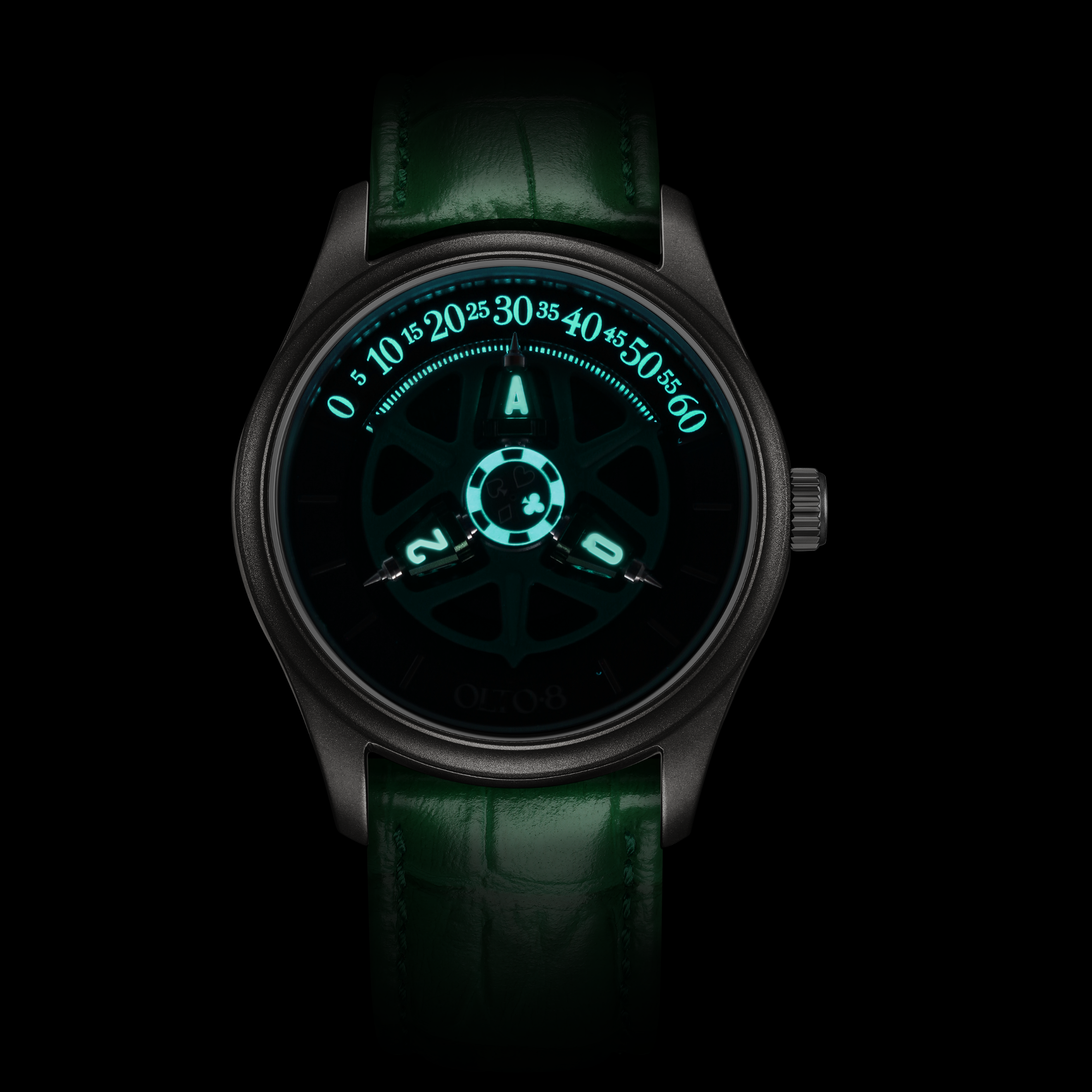 لك ساعة OLTO-8 KING 3D Satellite Hour Wheel أوتوماتيكية باللون الأخضر اليشم تأتي الساعة مع ضمان الحماية لمدة خمس سنوات :
