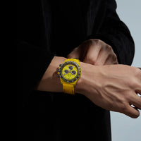The watch is protected by a sapphire crystal, providing superior scratch resistance and long-lasting clarity. Its carbon fiber bezel, inspired by high-performance engineering, is crafted under extreme conditions to achieve impressive tensile strength, hardness, and durability; making it both visually striking and functionally robust.