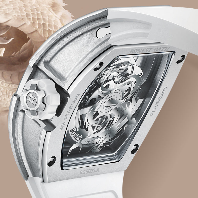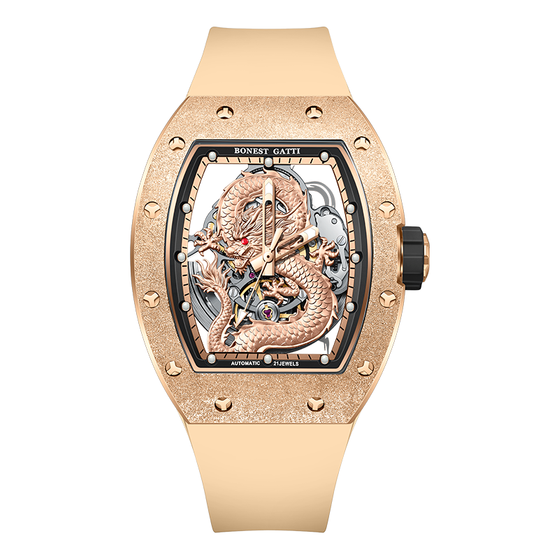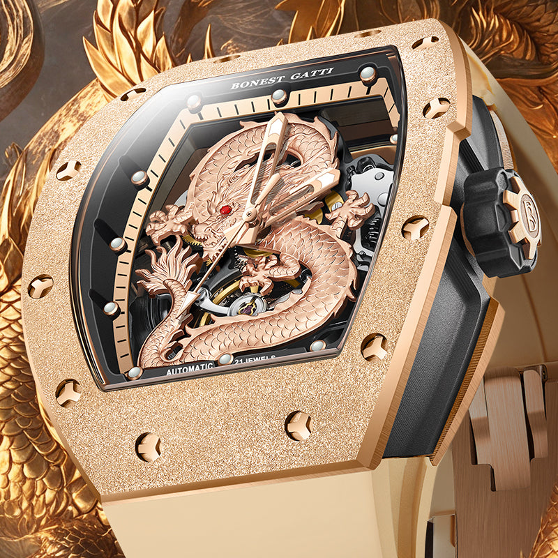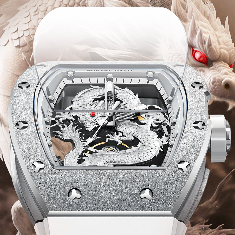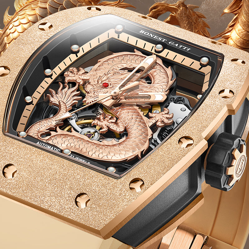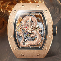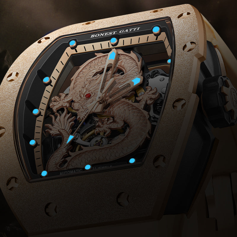 At the heart of the design lies a three-dimensional sculpted dragon dial, symbolizing courage, authority, and prosperity. The open-worked structure reveals the mechanical soul beneath, allowing the automatic winding movement to be admired in motion. Every detail reflects precision, artistry, and raw mechanical beauty.